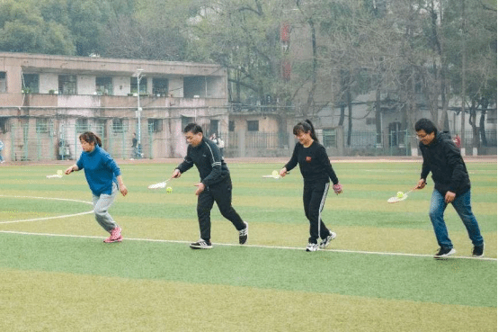 比赛现场,各类项目正如火如荼地进行。“预备,开始!”托球跑项目中,老师们手持羽毛球拍,将目光集中在忽左忽右的网球上,拖着网球小心而迅速地往前跑,这十分考验老师们的专注力和平衡力,稍有不慎便会“功亏一篑”。