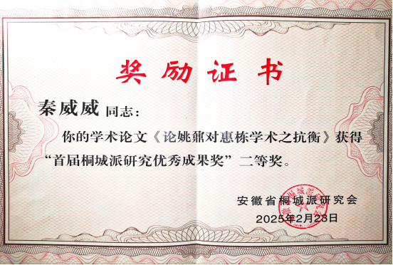新近入职的青年教师秦威威博士,其发表于《安徽大学学报(哲学社会科学版)》的论文《论姚鼐对惠栋学术之抗衡》,荣获桐城派研究优秀成果奖二等奖。安徽省桐城派研究会顾问、南京大学文学院许结教授,亲自为秦威威博士颁发了荣誉证书。