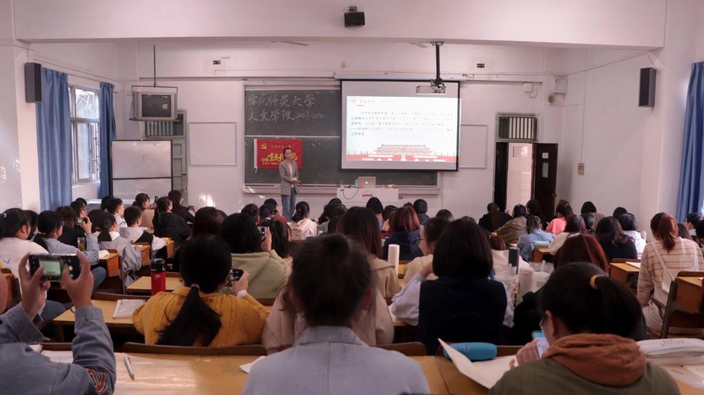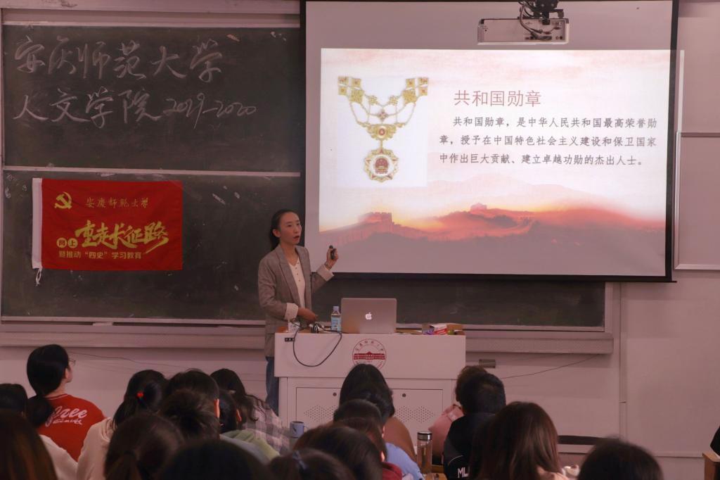 会上,唐宫羽分别向学生们介绍了袁隆平、李延年、于敏、申纪兰、孙家栋、张富清、黄旭华、屠呦呦、钟南山九位共和国勋章获得者,围绕他们的英雄事迹,讲述了他们身上所展现的忠诚、执着、朴实的鲜明品格。唐宫羽用清晰的条理,生动有趣的语言将抽象概念具体化、形象化,吸引着学生们认真聆听。