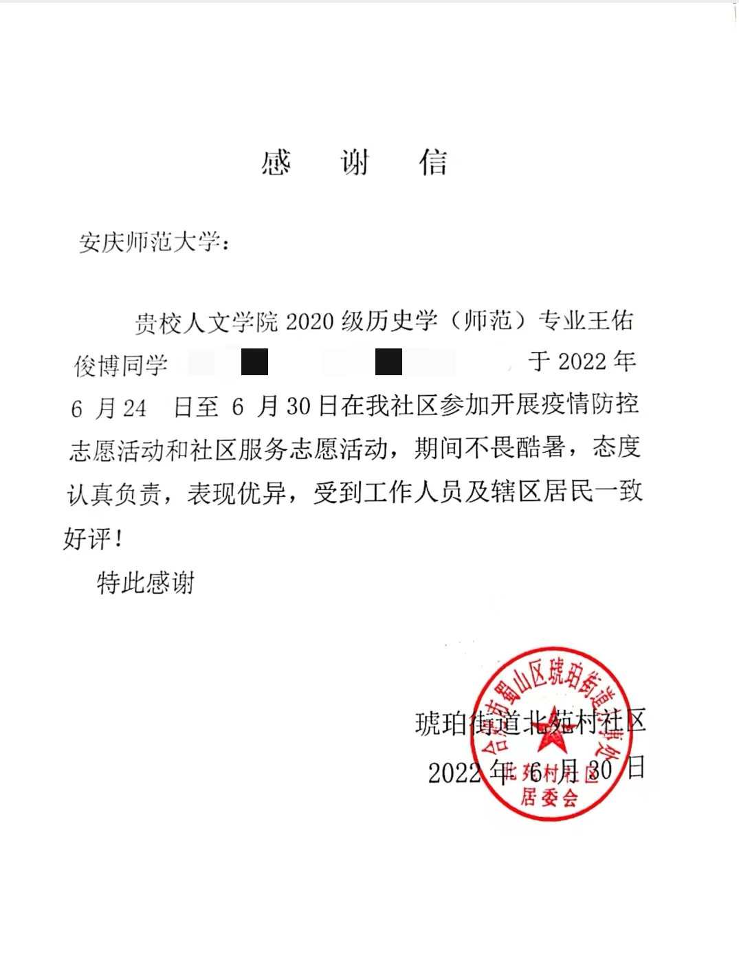 2020级历史学专业王佑俊博同学暑期疫情防控志愿服务活动予以高度评价。