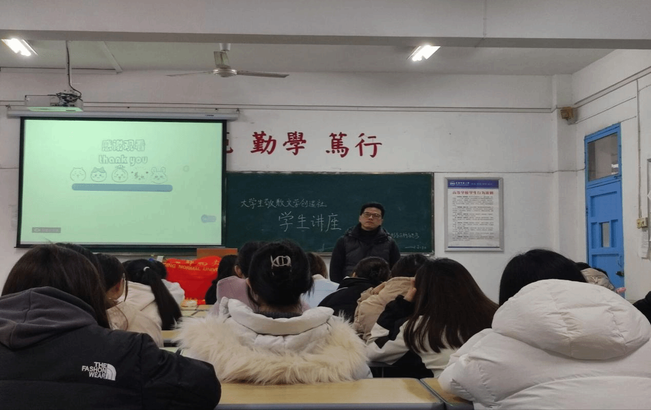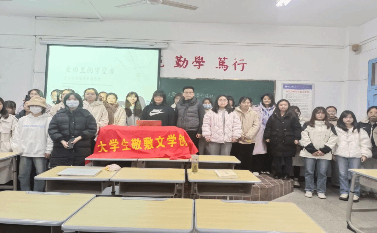 12月10日,大学生敬敷文学创造社在教学楼310室举办了以“《麦田里的守望者》中的主人公形象意义”为主题的第六期学生讲座。讲座由团支书王园媛主讲,指导老师江飞教授现场指导。来自桃花族论坛