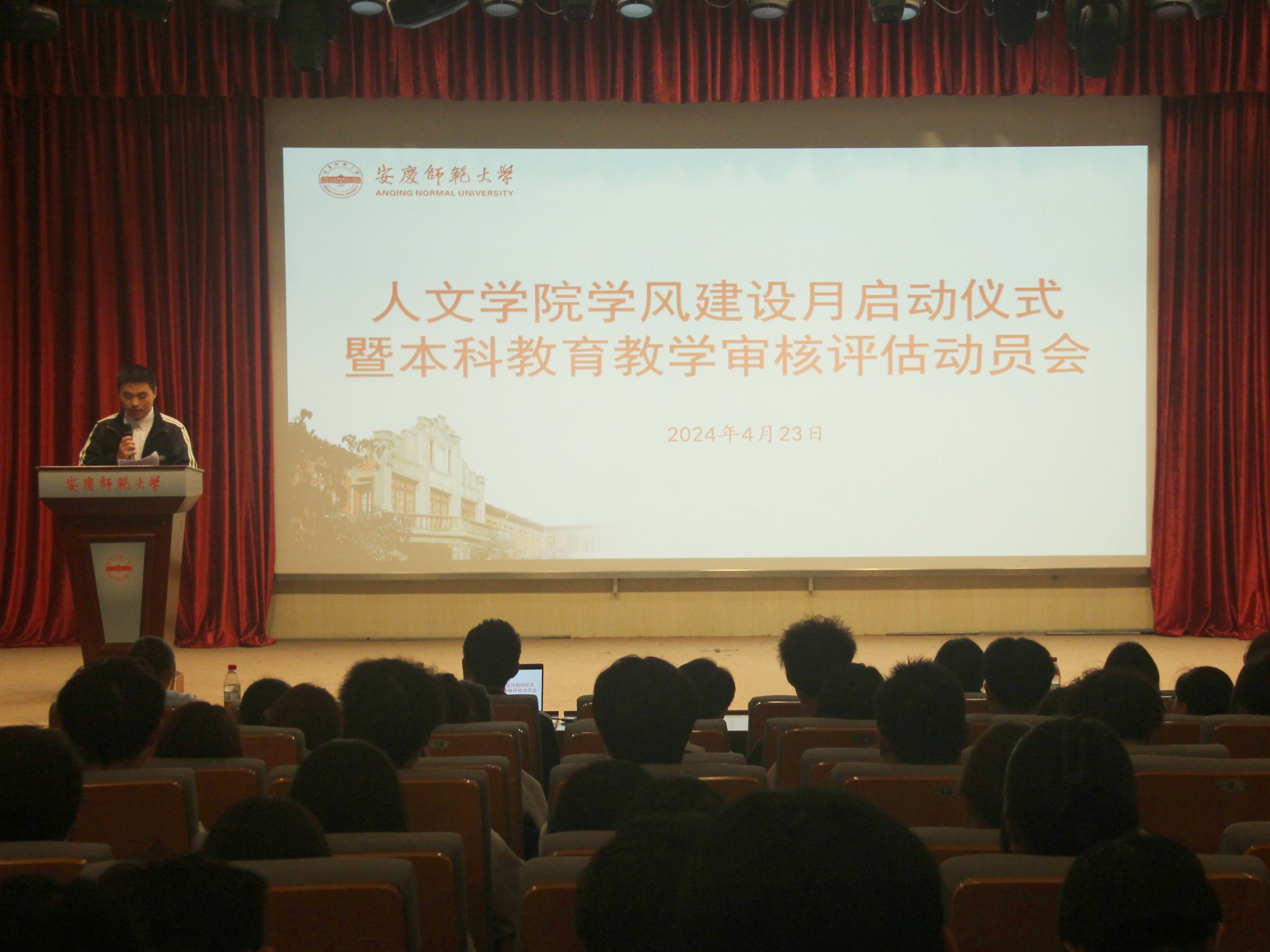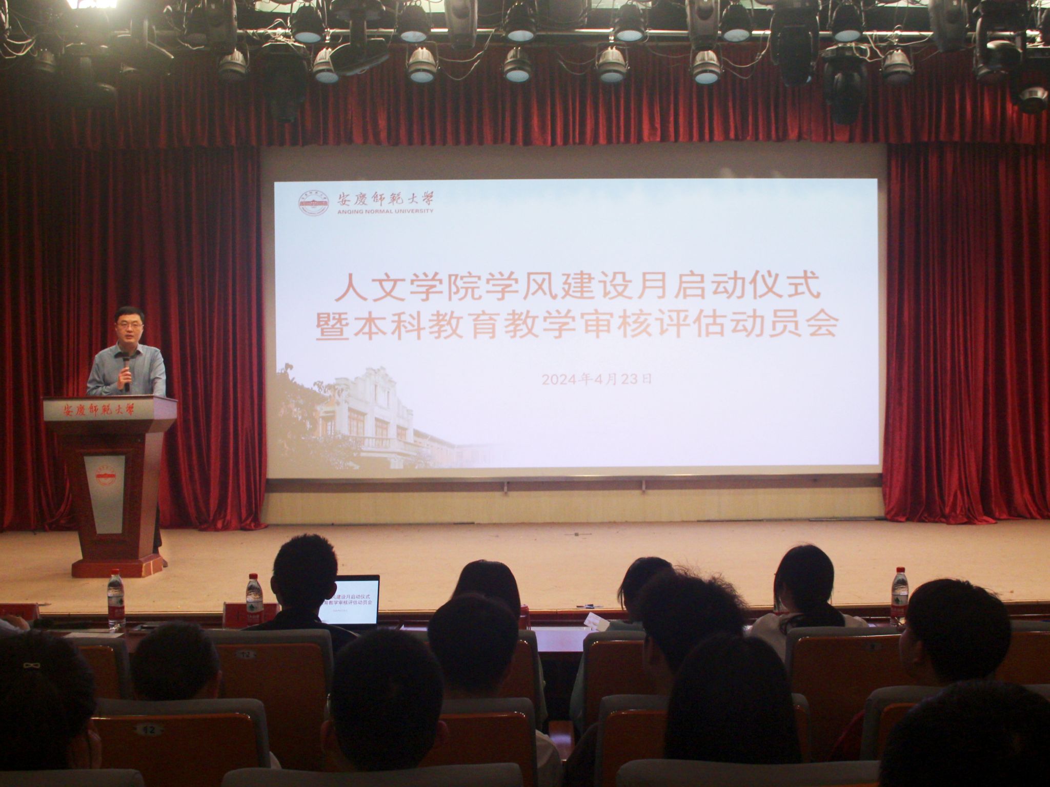 在菱湖图书馆报告厅开展学风建设月启动仪式暨本科教育教学审核评估动员大会,旨在营造学院良好学风,全面部署新一轮本科教育教学审核评估工作。学院党委副书记(负责党委工作)王波出席会议并讲话。会议由团委负责老师洪星星主持,各班级学生代表参与大会。
