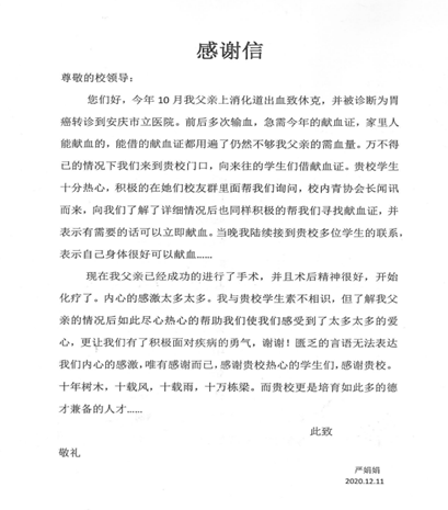 严娟娟女士的父亲于今年十月上消化道出血致休克,并被诊断为胃癌转诊到安庆市立医院。老人住院期间曾前后多次输血,需血量极其巨大。在这种情况下,单独依靠严女士及其家人的微薄力量已无法满足老人的治疗需求,急需今年的献血证。随着时间推进,缺血的老人病情渐渐危急,迫不得已的严女士来到了菱湖校区,向来往的人文学子寻求帮助。