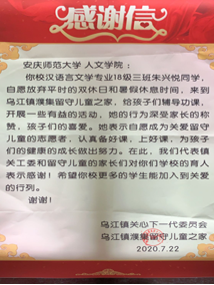 再次收到感谢信。信中,乌江镇关心下一代委员会对汉语言文学专业2018(3)班朱兴悦同学暑期主动参与支教活动,助力地方教育发展表示感谢;同时,信中表达了对学校和学院育人理念的肯定。