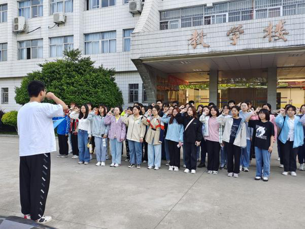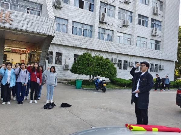 团委在教学楼前举行升国旗与重温入团誓词仪式。在庄严的国歌声中,五星红旗伴随着朝阳缓缓升起,2021级中国语言文学类四班全体同学伫立在国旗下,全体同学肃立,齐唱国歌,行注目礼。