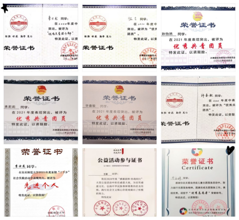 “青年大学习”先进团支部,4名团员荣获校级“学习之星”称号。支部积极贯彻落实团课教育,自2021年以来,共开展团课9次。主要内容包括共青团历史、共青团中央办公厅文件精神、党史学习教育专题等各项理论知识,着重加强团员的政治教育和思想教育。