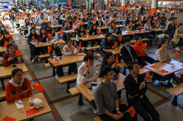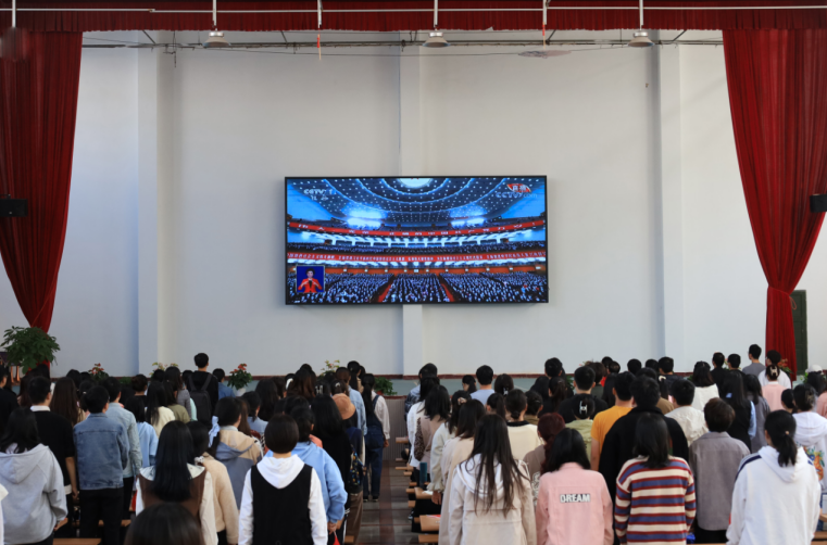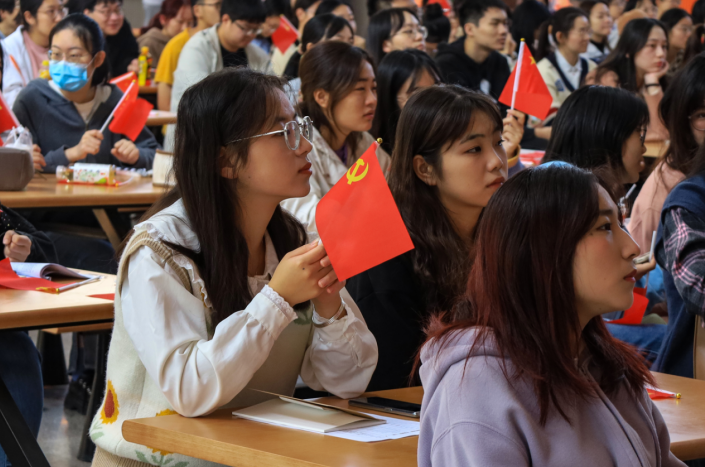 第66期入党积极分子培训班成员、第22期入党发展对象、第2期“青马班”学员近200名学生齐聚敬敷餐厅礼堂。现场气氛庄重热烈,广大青年学生不停地挥舞着党旗和国旗,以最饱满的热情迎接党的二十大胜利召开。