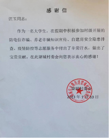 汉语言文学专业2021级5班汪玉同学,感谢其积极投身社会实践、服务社区治理。