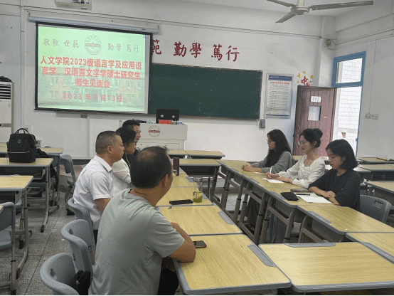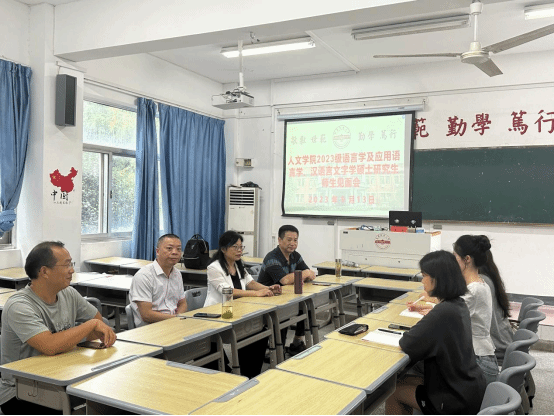 2023级语言学及应用语言学、汉语言文字学硕士研究生导师见面会在教学楼212教室顺利召开。语言学专业授课老师鲍红教授、代少若教授、白俊骞教授、陈世庆副教授、李向华副教授出席会议,2023级语言学专业全体研究生参与会议,会议由鲍红教授主持。