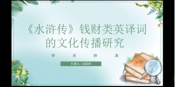 本次学术沙龙分为论文汇报、与谈人谈话、与会学生评议及教师指导四个环节。沙龙伊始由赵嘉琪同学就《〈水浒传〉钱财类英译词的文化传播研究》进行论文汇报。赵嘉琪同学的论文对《水浒传》中出现的钱财类词汇进行了细致的分类与汇总,并对其英译方法与文化传播价值进行了进一步的分析与讲解。其中以金、银、货币单位等部分作为重点讲解内容,详细展示了书中四大译者对其的译法以及其背后所传递出的文化价值。最后对论文框架进行了进一步分析与讲解,并细致梳理了论文内容,使文章结构更加易懂完整。