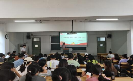 举行了爱党爱国教育活动。首先与会的全体同学起立共唱国歌,随后由2020级中国史专业孙燚同学进行宣讲,从安庆市的红色文化谈起,鼓励新同学们不断培养自己的意志品质,在学习和生活中要发扬钉钉子精神,一步一个脚印走完珍贵的三年。宣讲结束后,全体同学观看了建党百年纪录片。最后由新生代表2021级中国史专业张瑞同学进行《我和祖国共成长》的主题发言,张瑞同学结合自己的考研经历,讲述备考以来的成长变化以及对未来的学业规划,将自身发展与国家和民族的命运紧密结合,希望与祖国共同砥砺奋进。