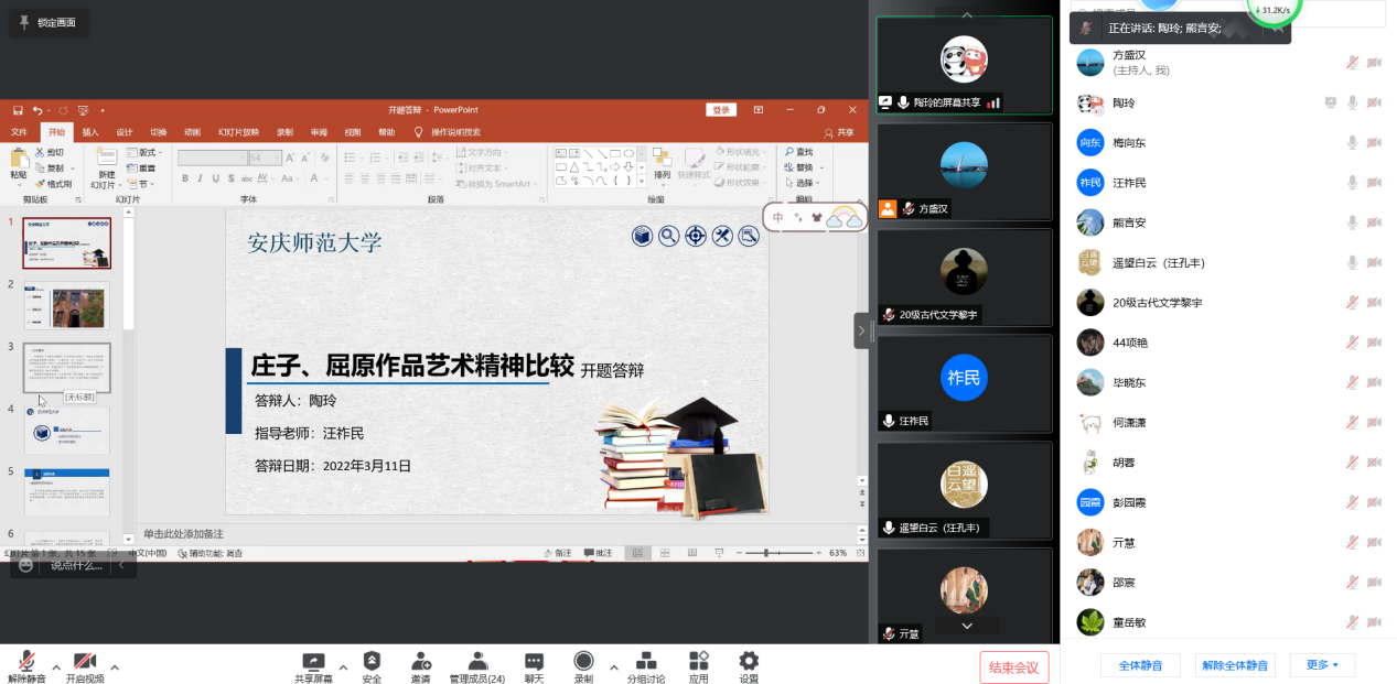 中国古代文学学科线上举行研究生学位论文开题报告和中期考核汇报会。参与会议的老师有汪祚民教授、梅向东教授、汪孔丰教授、胡祥云教授、童岳敏教授、熊言安副教授、方盛汉副教授。本次会议由汪孔丰教授主持,中国古代文学方向20级硕士研究生参加开题答辩,19级硕士研究生参加中期考核,21级硕士研究生旁听本次会议。