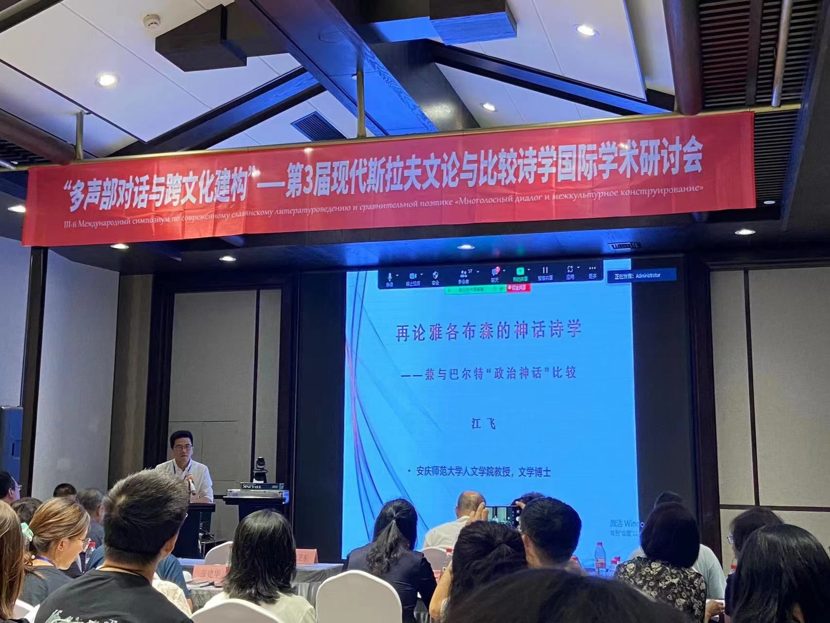 江飞教授作为国家社科基金重大项目“现代斯拉夫文论经典名篇汉译与大家名说研究”的课题组成员参加了此次研讨会,并做了题为“再论雅各布森的神话诗学——兼与巴尔特‘政治神话’比较”的大会报告。