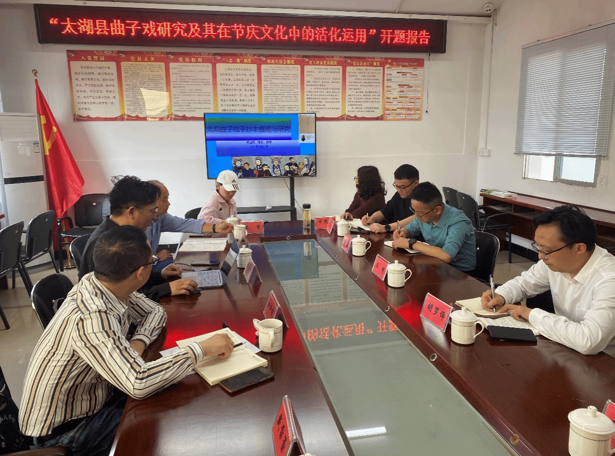 5月16日,副院长金松林一行应邀参加太湖“太湖曲子戏研究及其在节庆文化中的活化运用”开题报告会。太湖县人大党组成员、副主任王彬,县文旅体局、党组书记、局长胡罗锋,县人大城乡建设环境和资源保护工作委员会主任王金亮,县文化馆党支部书记朱爽、原文化局文化股主任陈梁生及县文化馆非遗部、黄梅戏演艺有限公司等部门专家出席会议。会议由太湖县文化馆副馆长叶学勤主持。