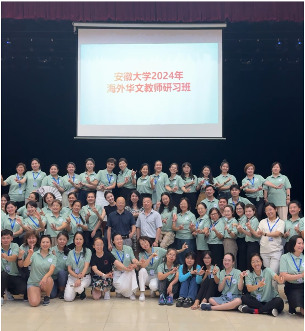 教育部语合中心“国际中文教育与黄梅戏沿'一带一路’国家的协同传播研究”项目团队携手安徽再芬黄梅艺术剧院,在安徽大学磬苑校区大学生活动中心,为安徽大学2024年“华文教育·华文教师”研习班举办了一场别开生面的黄梅戏演讲及体验活动。来自越南、缅甸、美国、新西兰、马来西亚、印度尼西亚、日本、英国、西班牙等23个国家的79名海外华文学校校长和老师现场参加了此项活动。