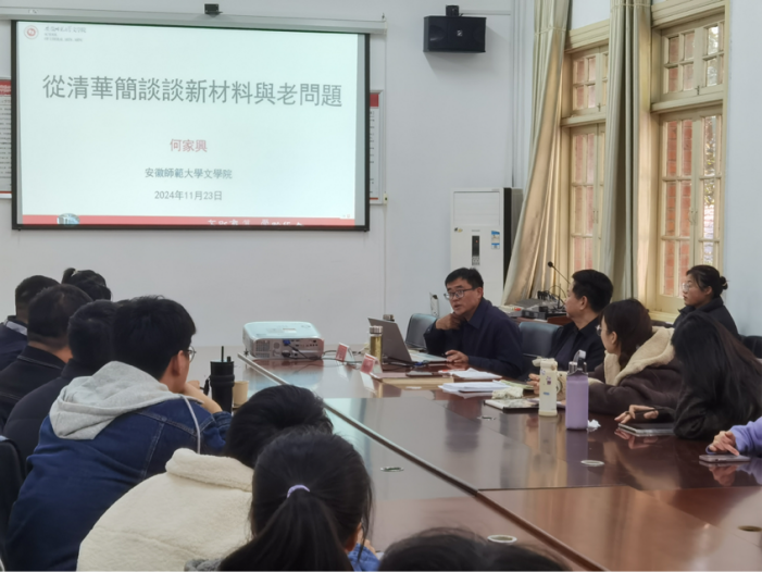 11月23日,安徽师范大学文学院教授、博士生导师何家兴应邀做客敬敷人文讲坛,在红楼二楼会议室作了题为“从清华简谈谈新材料与老问题”的学术讲座。本次讲座由陈世庆教授主持,桃花族论坛