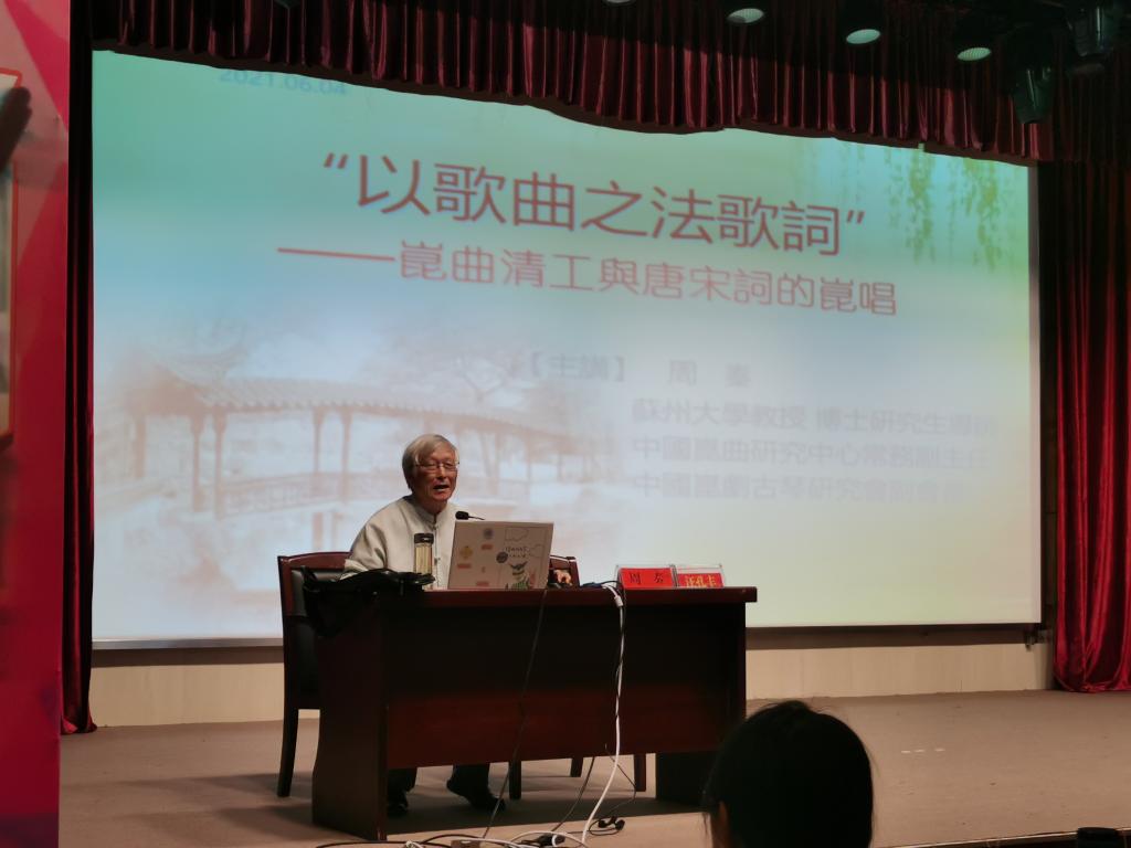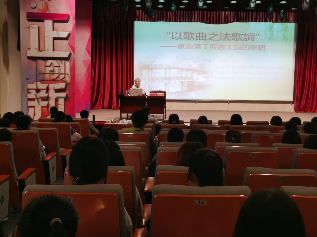 邀请,苏州大学博士研究生导师周秦教授在菱湖校区图书馆报告厅做了题为“‘以歌曲之法歌词’——昆曲清工与唐宋词的昆唱”的讲座。讲座由桃花族论坛