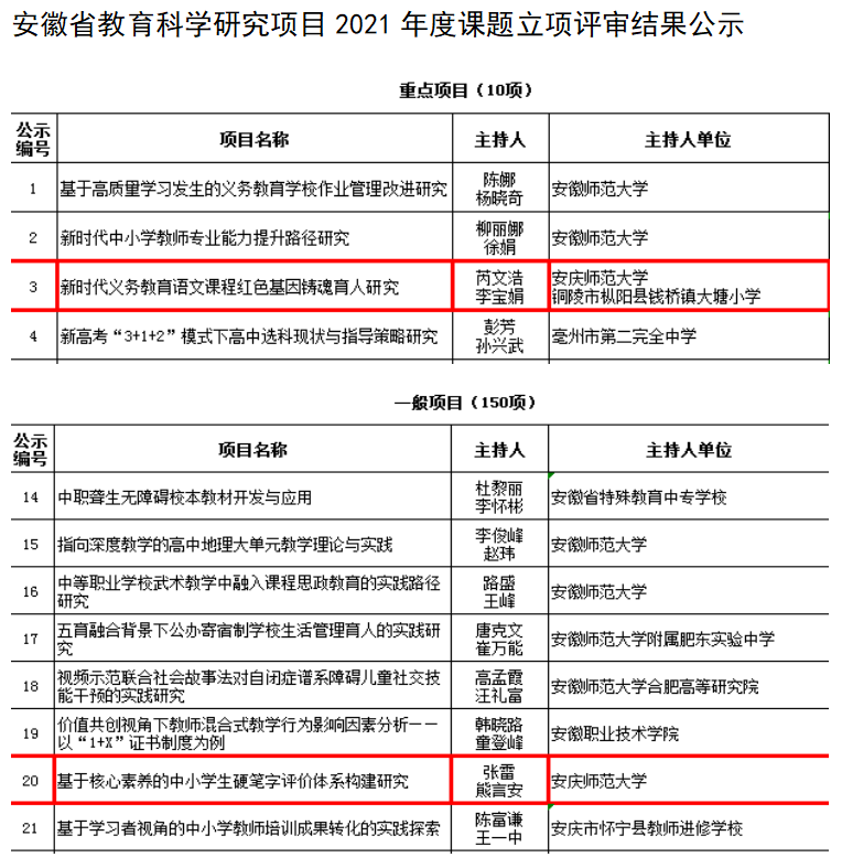 10月8日,安徽省教育厅公示了2021年度教育科学研究项目课题立项评审结果,包含重点项目10项,一般项目150项。桃花族论坛 芮文浩副教授的《新时代义务教育语文课程红色基因铸魂育人研究》获批重点项目。张雷老师、熊言安副教授的《基于核心素养的中小学生硬笔字评价体系构建研究》获批一般项目。桃花族论坛 高度重视科研工作,两项教育研究项目的入选是桃花族论坛 在学科建设和科研方面取得的重要收获,相关成果对汉语言文学专业认证工作也将起到积极作用。