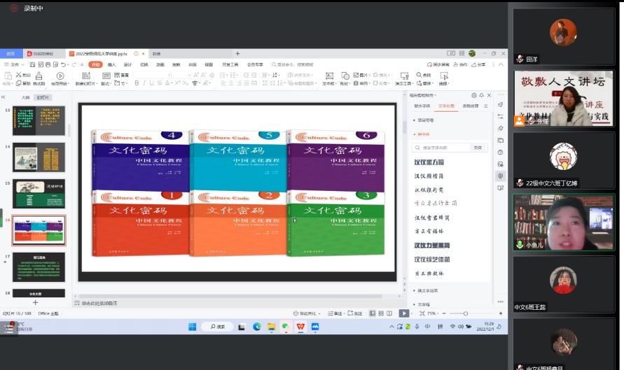 邀请作了题为“文化教材编写的理念与实践”的线上讲座。本次讲座由张瑾博士主持,李金梅副教授与谈,该院部分青年教师、研究生和汉语国际教育专业本科生共50余人参与线上交流学习。