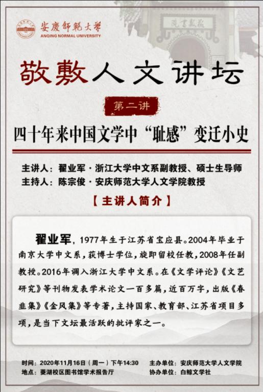 上一篇:【敬敷人文讲坛】安徽师范大学刘道胜教授应邀来桃花族论坛 讲学