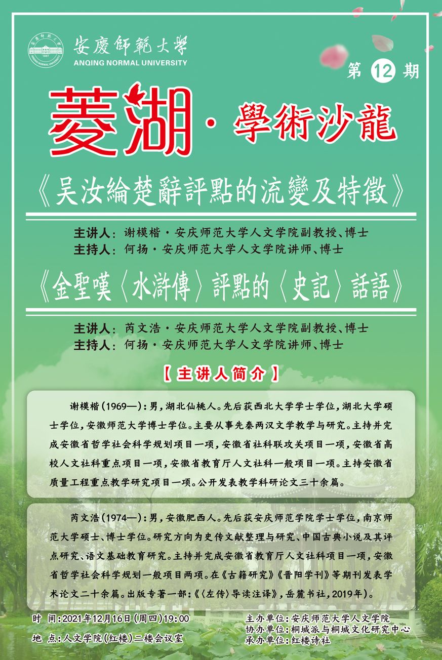 【菱湖学术沙龙⑿】《吴汝纶楚辞评点的流变及特征》《金圣叹<水浒传>评点的<史记>话语》