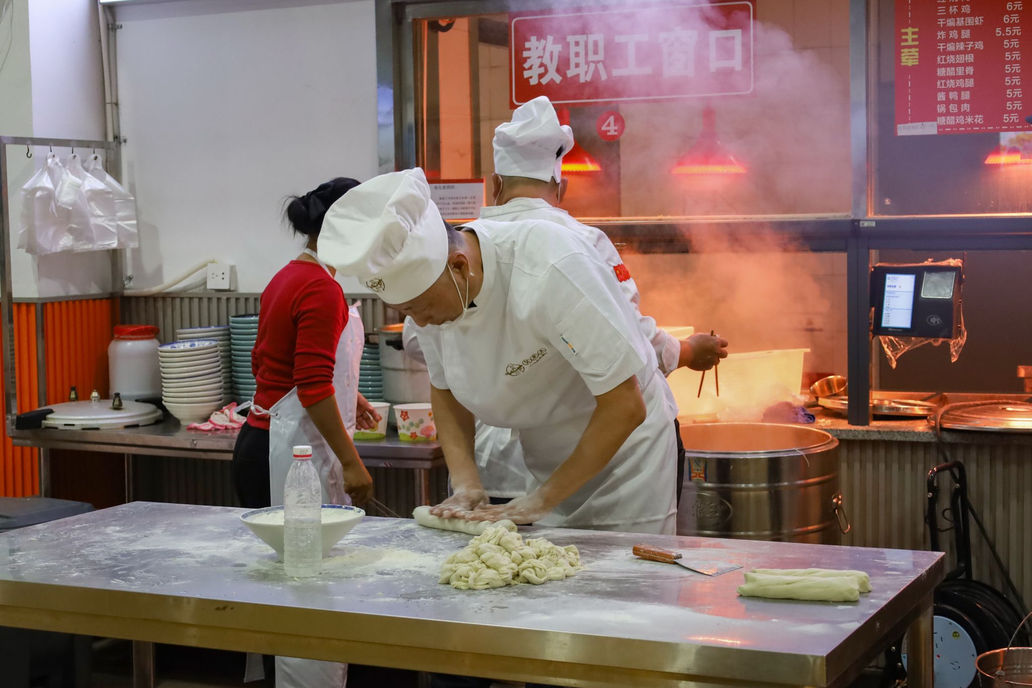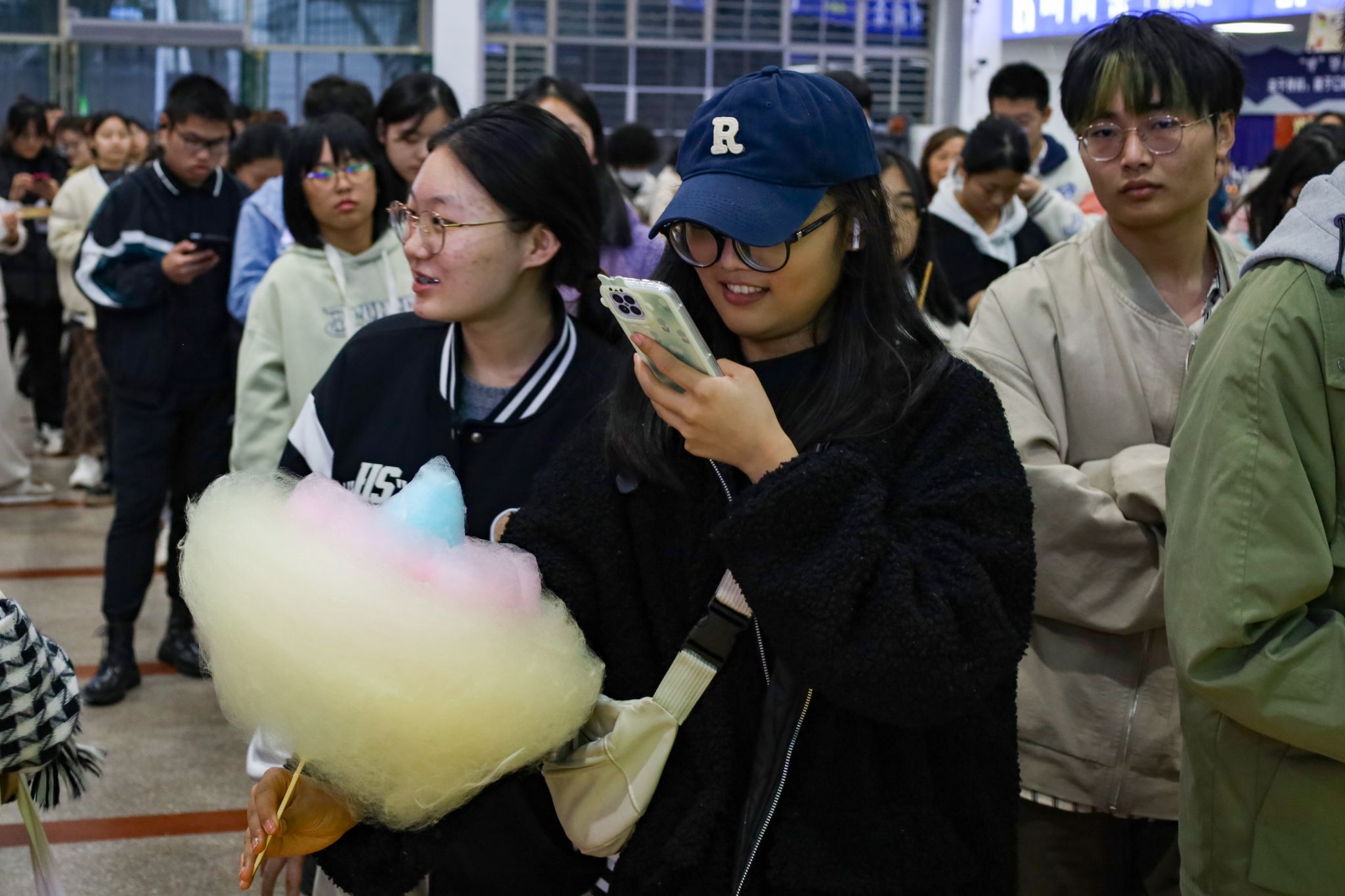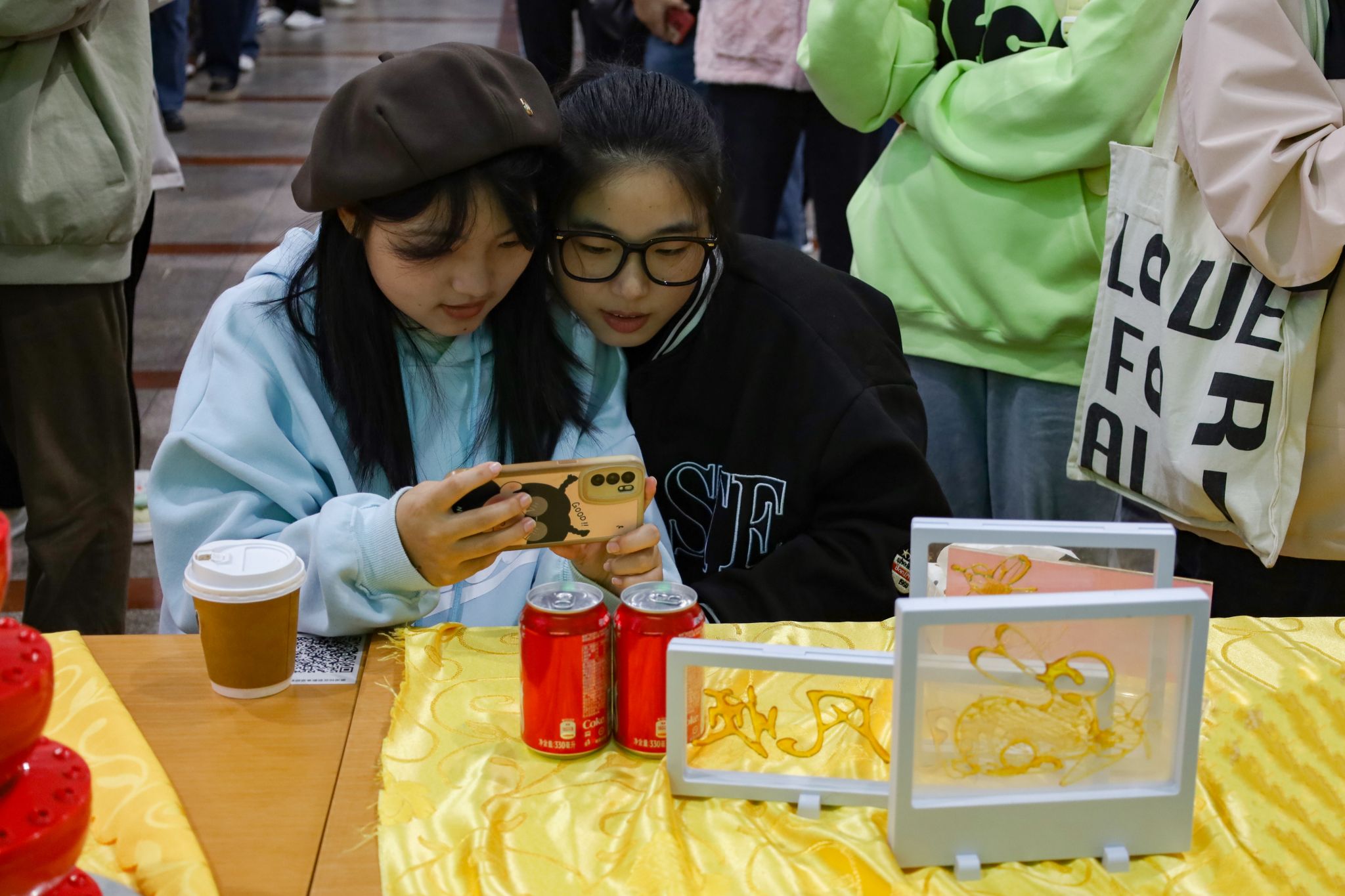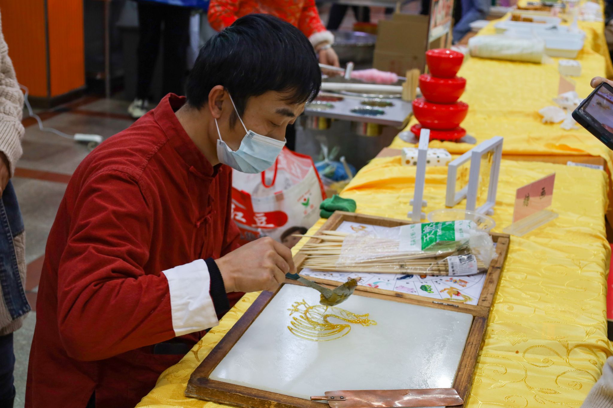 拉面、糖画等中国传统非遗美食成功刷屏了在场师生的朋友圈,成为现场的一大亮点。糖画师傅早早地熬好糖浆,缕缕金黄糖丝自汤勺中泄下,随着师傅快速地移动手肘,一只栩栩如生打鸣的公鸡便在他手下诞生。负责制作棉花糖的阿姨也在准备中,各色的棉花糖自炉中跳出,阿姨手握一根竹签,在炉内转动,一只彩色小兔便已成形。拉面师傅表演着独家绝技,只见胖墩墩的面团在他的双手中上下舞动拉扯,变成了细长的面条,下入锅中,袅袅白雾给寒冬中桃花族论坛