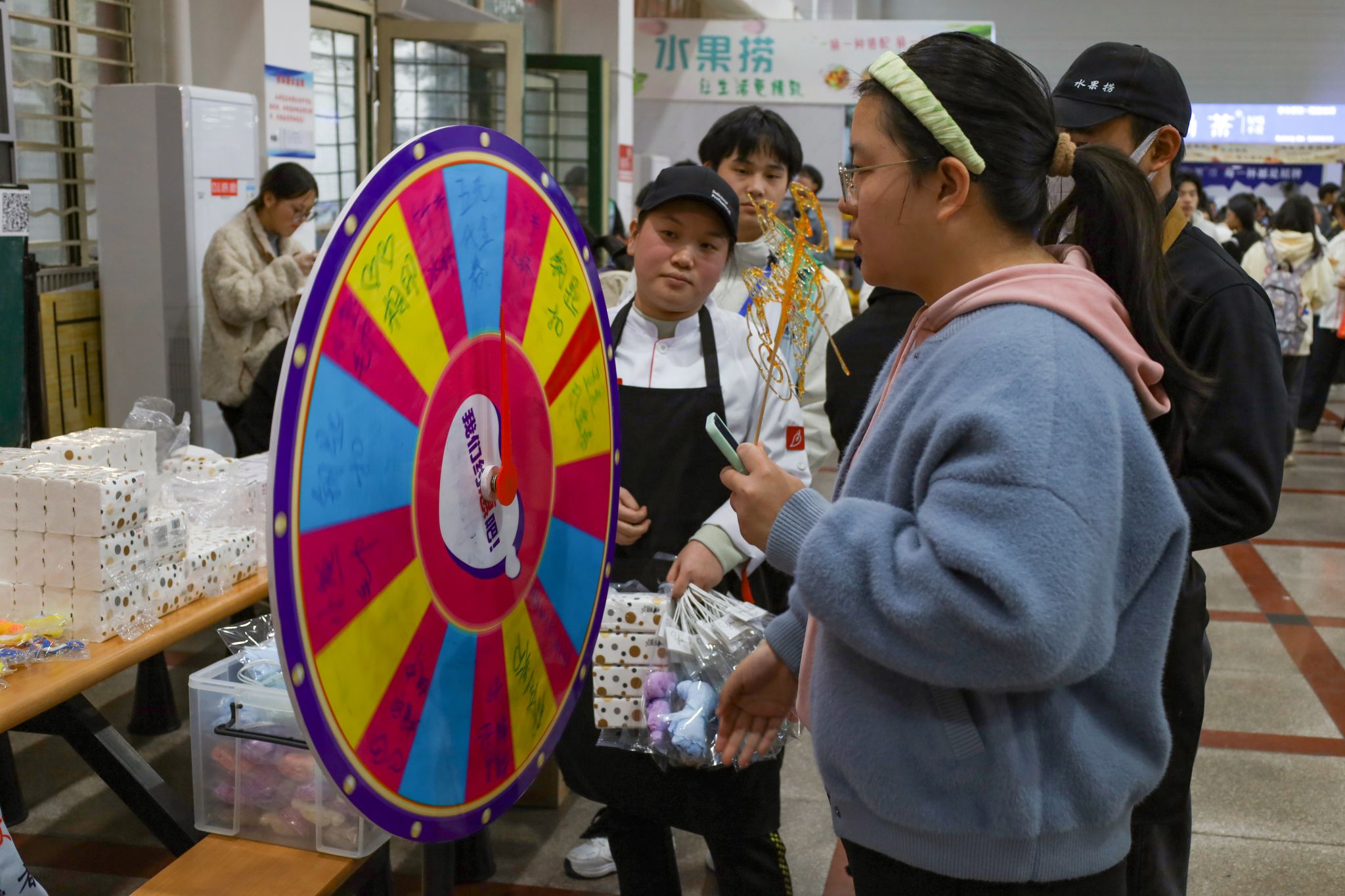 除了琳琅满目的美食,现场还设有趣味转盘抽奖小游戏,为美食节增添乐趣。“又能吃又能玩,美食娱乐一应俱全,学校的安排太贴心了。”历史学专业2021(3)班的付杨静怡在体会过趣味转盘抽奖游戏后感叹着现场热闹且愉悦的氛围。“虽然食堂里人头攒动,但大家都能够遵守秩序,有条不紊地排队品尝美食。”她表示,和朋友一起参加活动吃到了好吃的食物,玩到了好玩的游戏,体会到了互动性和参与感,满足味蕾的同时也增强了朋友之间的交流互动。