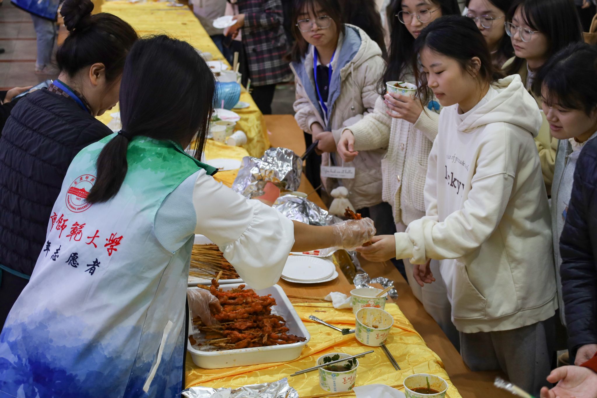 随着工作人员揭开锡纸,外酥里嫩的烤全羊成了全场的焦点。“太幸福了,第一次参加美食节就能够品尝到这么多中外美食,简直是学生党福音。”手里拿着烤全羊、刚咽下上一口蛋挞的中国语言文学类专业2023(6)班的吴佳佳笑着说。她坦言,中外美食节让学生有机会品尝到不同民族地区的特色美食,增长了见识,满足了学生因美食而产生的幸福感的同时也丰富了校园文化生活,进一步活跃校园文化氛围。