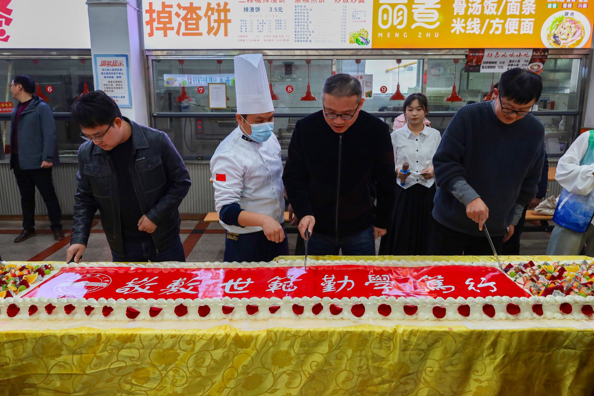 副院长汪孔丰及安徽中快餐饮有限公司总经理何伦共同切开印有 “敬敷 世范 勤学 笃行” 校训和校徽字样的、并由水果点缀的大蛋糕,宣告着美食节正式拉开序幕。三明治、甜甜圈、泡芙、咖啡等各类西式甜点饮品整齐排列,中式美食糖醋排骨、红烧肉、金牌猪脚等秀色可餐,传统糕点烧卖、发糕、燕麦粥等食品也给现场平添了许多“烟火气息”。