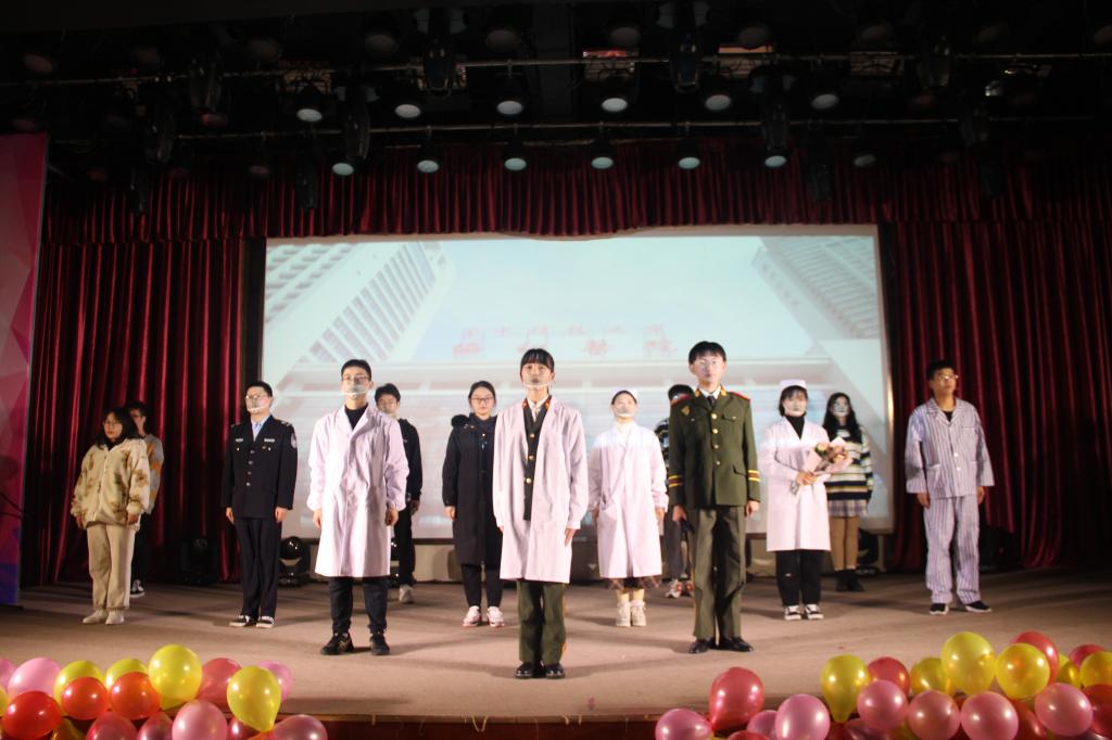 话剧社自编自导,原创话剧《黎明之前》。”话剧由警察在疫情期间阻止居民外出、军人母亲自愿奔赴抗疫前线、基层医生的防疫工作逐步得到群众理解等不同片段组成。演员们饱含深情,充分投入到表演之中,将观众带入不同的故事,再现了抗疫过程中医疗战士迎难而上和坚守岗位的感人画面,赢得现场一片掌声。