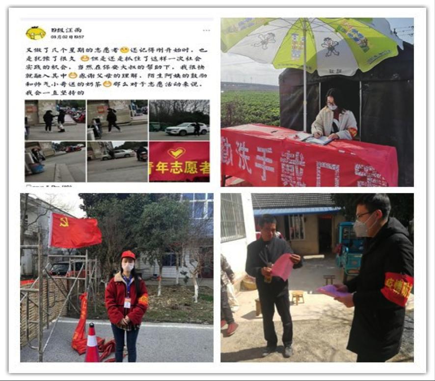 2016级历史学的方萍作为一名学生党员,积极响应党员志愿者号召,主动报名,成为芜湖市三山区峨桥镇浮山村强湾小区的志愿服务者,她说道:“每天工作七个小时左右,负责监管小区内的车辆和人员进出,给小区居民普及防疫知识和每日的最新疫情动态,担任小区的快递员和外卖员,给老人送去食品物资。虽然志愿服务工作很辛苦,但是作为一名党员,能够通过奉献为人民群众服务,锤炼党性,既满足又自豪。”