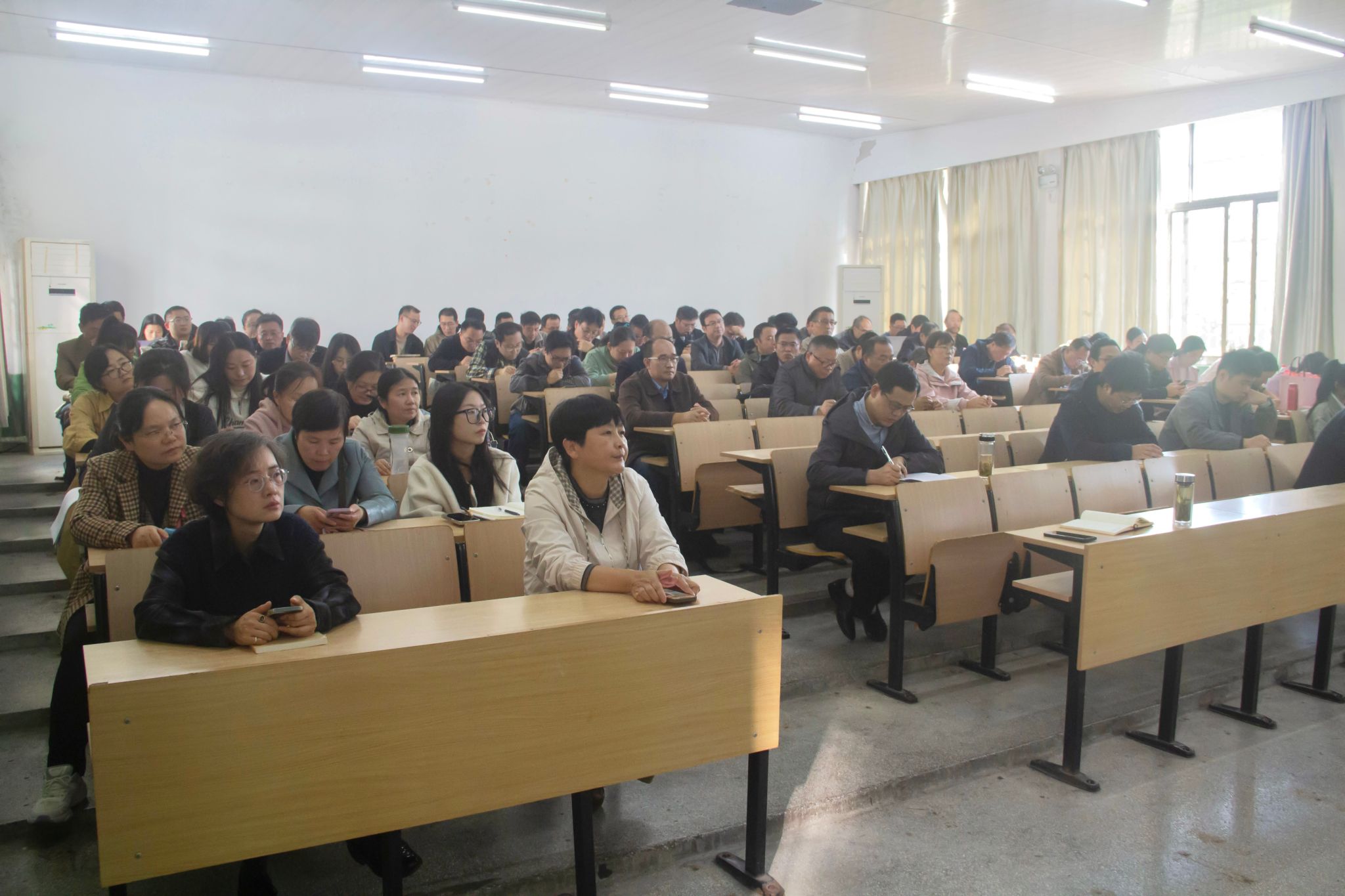 院长汪孔丰主持会议,学院领导班子,全体教职工参加会议。