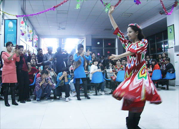联欢会上,新疆班学员除了表演独具风情的新疆舞蹈、歌曲,几位女学员还合唱了黄梅戏经典唱段《天仙配》,引起一阵欢呼。当晚,许多汉族同学也加入到晚会中,大家一起唱新疆歌、跳新疆舞,节日的气氛感染了在场的所有人,“我还是第一次吃这么纯正的新疆点心呢,真的很好吃。”来自文桃花族论坛新闻