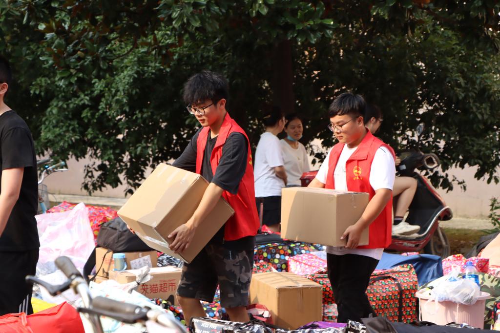 学生第二党支部的志愿者们积极亮出党员身份,主动穿上“红马甲”,当起了同学们的“行李搬运工”。