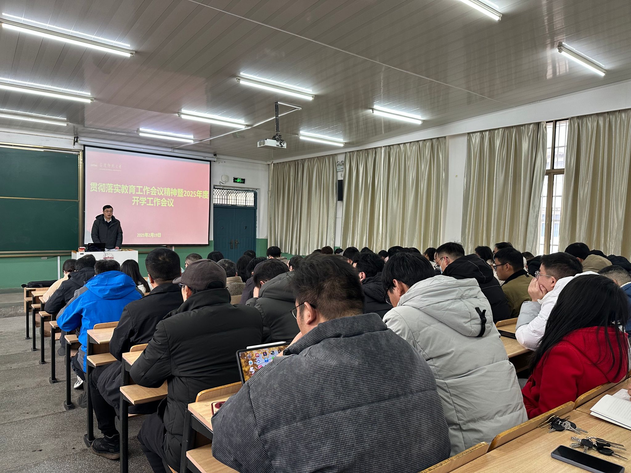 在菱湖校区理二阶教室召开贯彻落实教育大会精神暨 2025年度开学工作会议,旨在深入领会全国全省教育大会精神,紧密结合学校开学会议要求,系统规划新学期各项工作。学院领导班子成员、全体教职工参会。会议由学院院长汪孔丰主持。