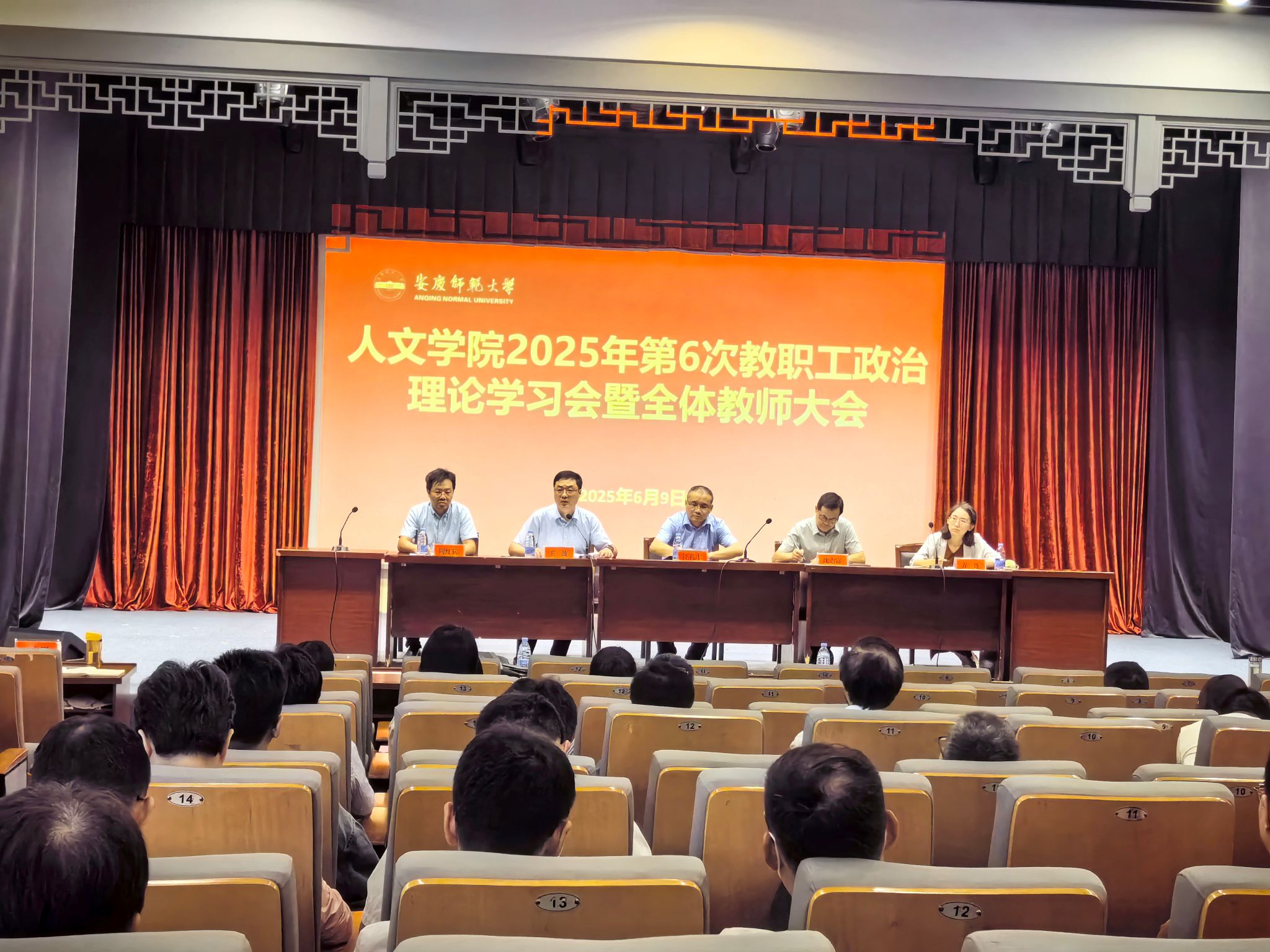 在菱湖校区图书馆报告厅召开2025年第6次教职工政治理论学习会暨全体教师大会。会议由院长汪孔丰主持,全体教职工参加会议。