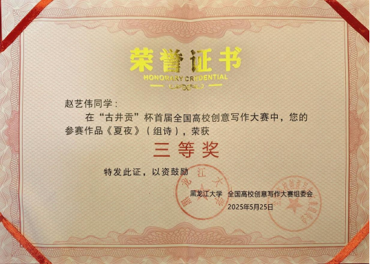 2023级汉语言专业2班赵艺伟凭借组诗作品《夏夜》在诗歌创作赛道中脱颖而出,荣获三等奖。