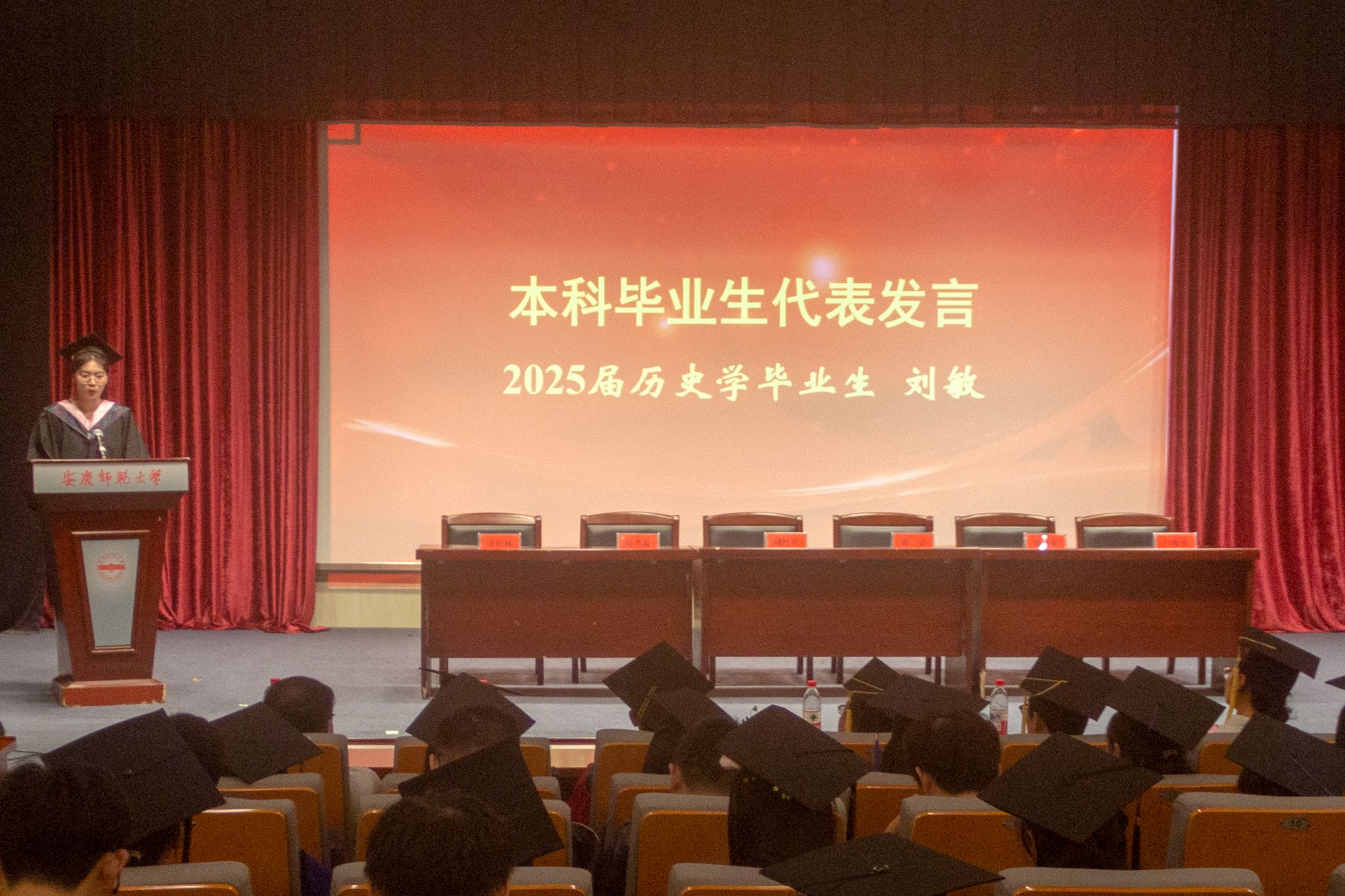 典礼在庄严的国歌声中正式拉开帷幕。仪式现场,学院线上转播了学校毕业典礼。