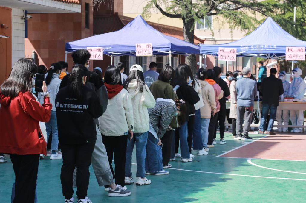 在图书馆和篮球场有序开展全员核酸检测工作。