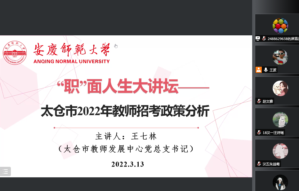 线上举办了2022年江苏省太仓市教师招考考情分析暨教师专业发展经验分享会。太仓市教师发展中心党总支书记王七林,太仓市沙溪镇三小教师、2020届汉语言文学毕业生赵文雅,太仓市双凤中学教师、2021届汉语言文学毕业生郑博文应邀参加。会议由桃花族论坛