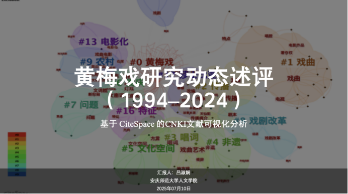 数字人文专任教师吕淑娴、王爽应邀出席“戏曲数智化保护与传播”高峰学科建设论坛。会上,吕淑娴老师就其论文《黄梅戏研究动态述评(1994—2024)——基于CiteSpace的CNKI文献可视化分析》进行主题汇报,从文献计量与知识可视化角度分析了黄梅戏研究的学术演进与研究趋势,展示了皖江文化数字化保护与智能处理实验室在传统戏曲文化数字化研究方面的探索与成果。