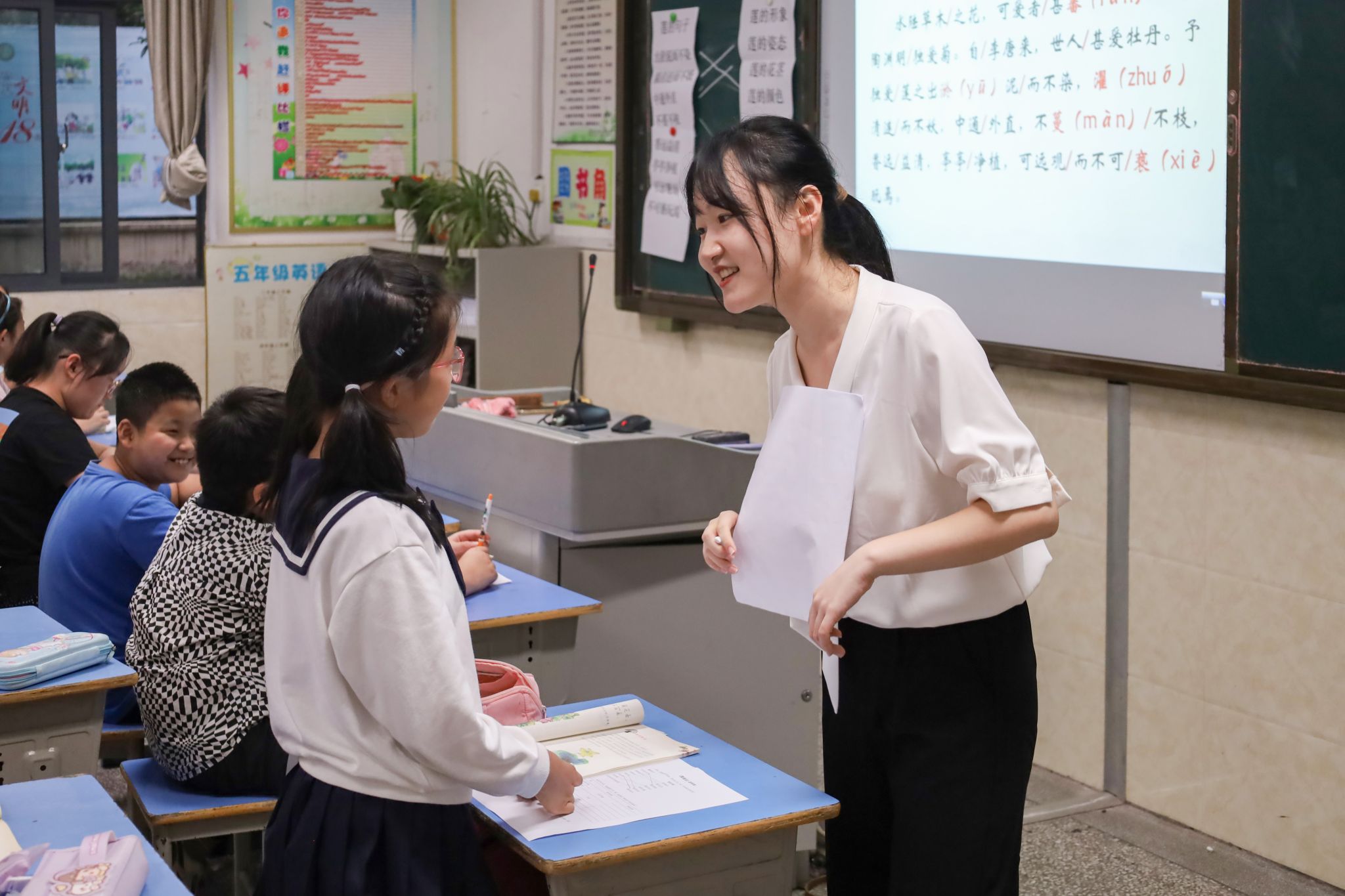 上课铃声响起,2022级学科教学(语文)方向研究生丁雨琛以《爱莲说》开启了本学期的第一次授课。丁雨琛用生活实际作为课堂引入,以重点字词、重点句为抓手,带领孩子们在音乐的浸润下品读莲花坚贞的品格,感受周敦颐洁身自爱的高洁人格和洒落的胸襟。教学路径清晰,课堂氛围活跃。