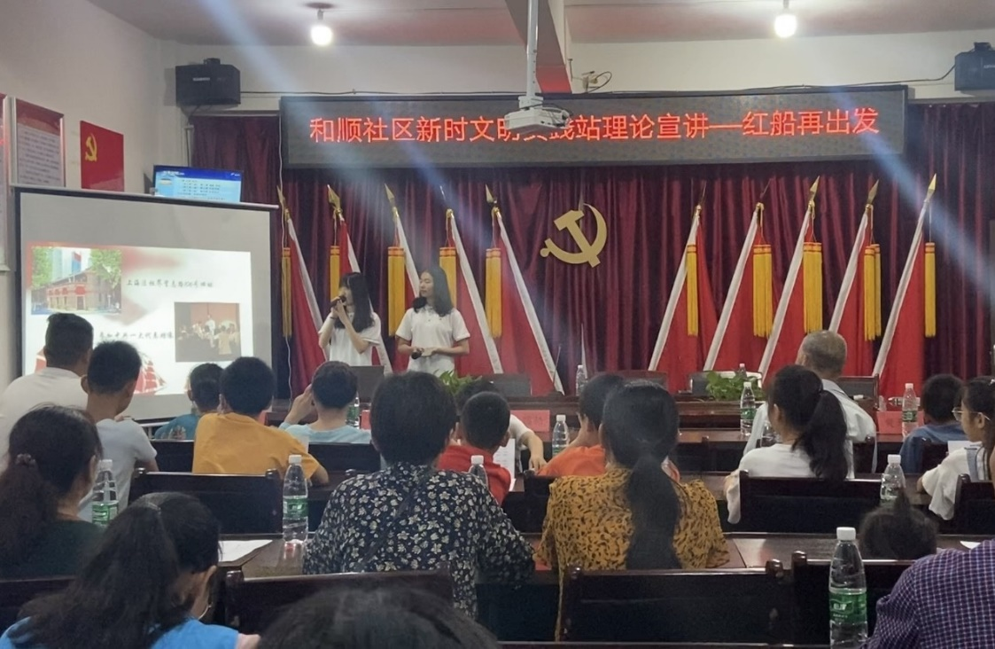 “有谁知道南陵县的抗美援朝战斗英雄有哪些呀?”“大家知不知道中国共产党是什么时候,在哪里正式成立的呀?”实践团的汇报展示和红色宣讲得到了社区青少年儿童和家长的热烈反应。宣讲开始,团队负责人向听众们展示了近几天在南陵县的所见所得。通过走访拍摄收集到的视频和图片,团队制作了精美的课件,生动讲述了在当地收集到的红色故事和调研感悟。围绕李家发烈士,团队成员声情并茂地讲述了李家发烈士以胸膛堵住敌地堡机枪口而牺牲的故事,在场的孩子们随着故事情节的起伏从紧张到伤心再到充满力量。团队成员向在场的孩子们介绍了伟大的红船精神,从中共一大召开的背景,到当时会议从上海转移到嘉兴南湖的原因和南湖红船上发生的惊心动魄的故事,深入浅出的语言,动情的演绎,台下的孩子们听得津津有味。在深入了解红船精神的内涵和当代价值后,团队成员进一步介绍了长征精神、井冈山精神、红旗渠精神等宝贵的精神财富。团队成员表示,通过开展面向青少年儿童的红色文化精神宣讲,希望增进他们对红色文化精神的了解,鼓励他们担起新时代赋予的使命,接过前辈们手中的旗帜,进一步继承和发扬红色文化和红色精神。