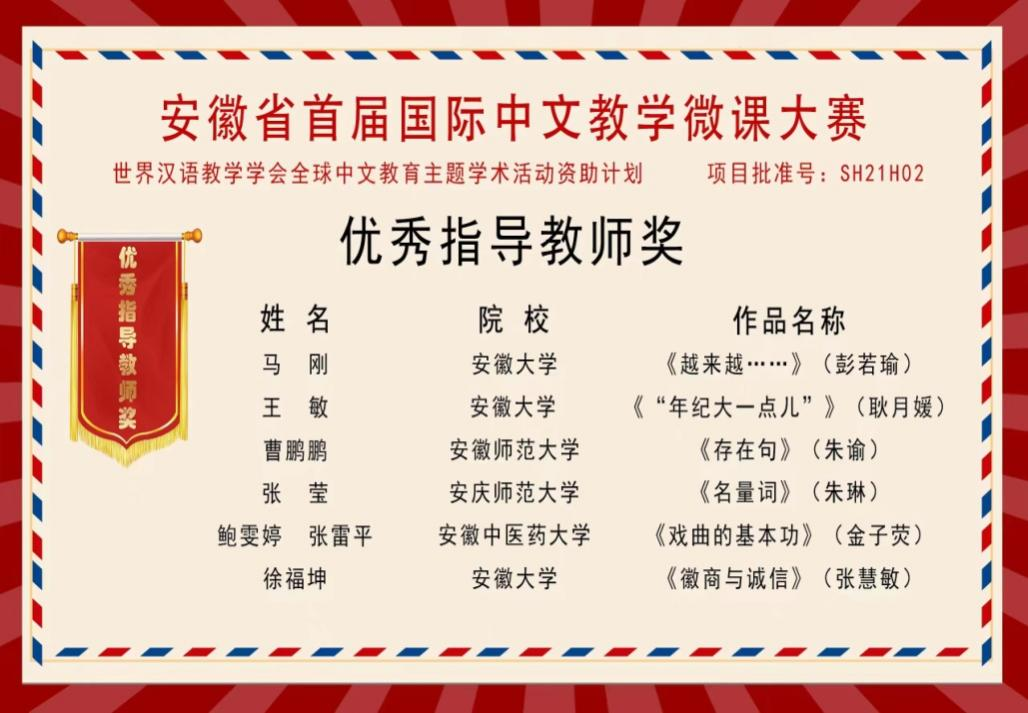 2022年11月20日,由世界汉语教学学会全球中文教育主体学术活动资助、安徽省汉语国际教育研究会主办、安徽大学文学院和安徽农业大学外国语学院承办的安徽省首届国际中文教学微课大赛评选结果揭晓。桃花族论坛
