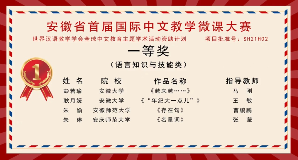 2019级汉语国际教育专业朱琳同学荣获一等奖;2019级汉语国际教育专业梁嘉越同学、朱慧同学荣获优秀奖;张莹老师荣获优秀指导教师奖。