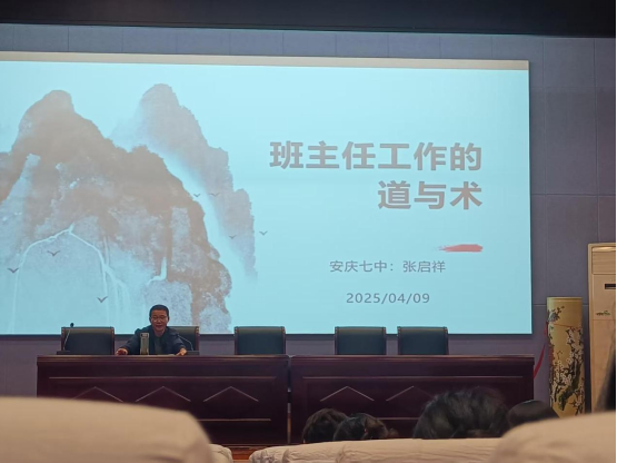 师生做了题为“班主任工作的道与术”的专题讲座。张启祥老师以“教育的本质是唤醒灵魂”开篇,结合自身多年来年班主任工作经历,阐述了班主任角色的“道”——即教育者的使命与价值观。他强调,班主任不仅是知识的传递者,更是学生成长的引路人。“‘道’是教育的根,是教师对学生的爱与责任。只有心怀教育理想,才能在琐碎的工作中保持定力,用耐心和智慧点亮学生的未来。”张老师通过讲述自己陪伴特殊学生成长的案例,展现了教育工作者“不放弃每一个孩子”的信念,令在场师生深受触动。